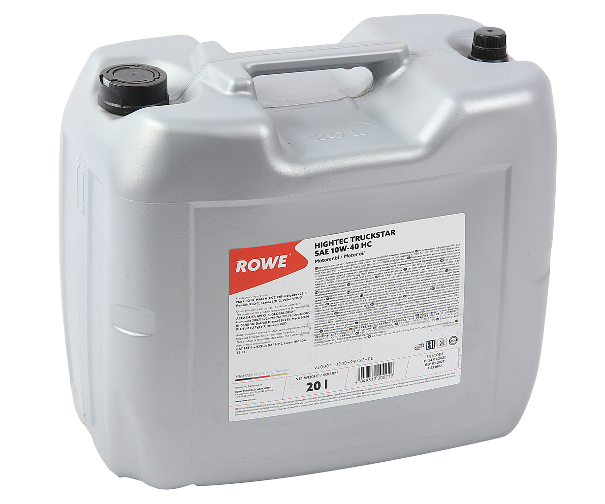 ROWE 20004020099 Масло моторное ROWE HIGHTEC TRUCKSTAR SAE 10W-40 HC (20л) ACEA E4,E7,API CI-4,GLOBAL DHD-1,Cummins 20071/-72/-75/-76/-77/-78,Deutz DQC III-05/III-10,Detroit Diesel 93K215,Mack EO-M PLUS,MTU Type 3,Renault RXD,Scania LDF-2CAT ECF-1-a/ECF-2
