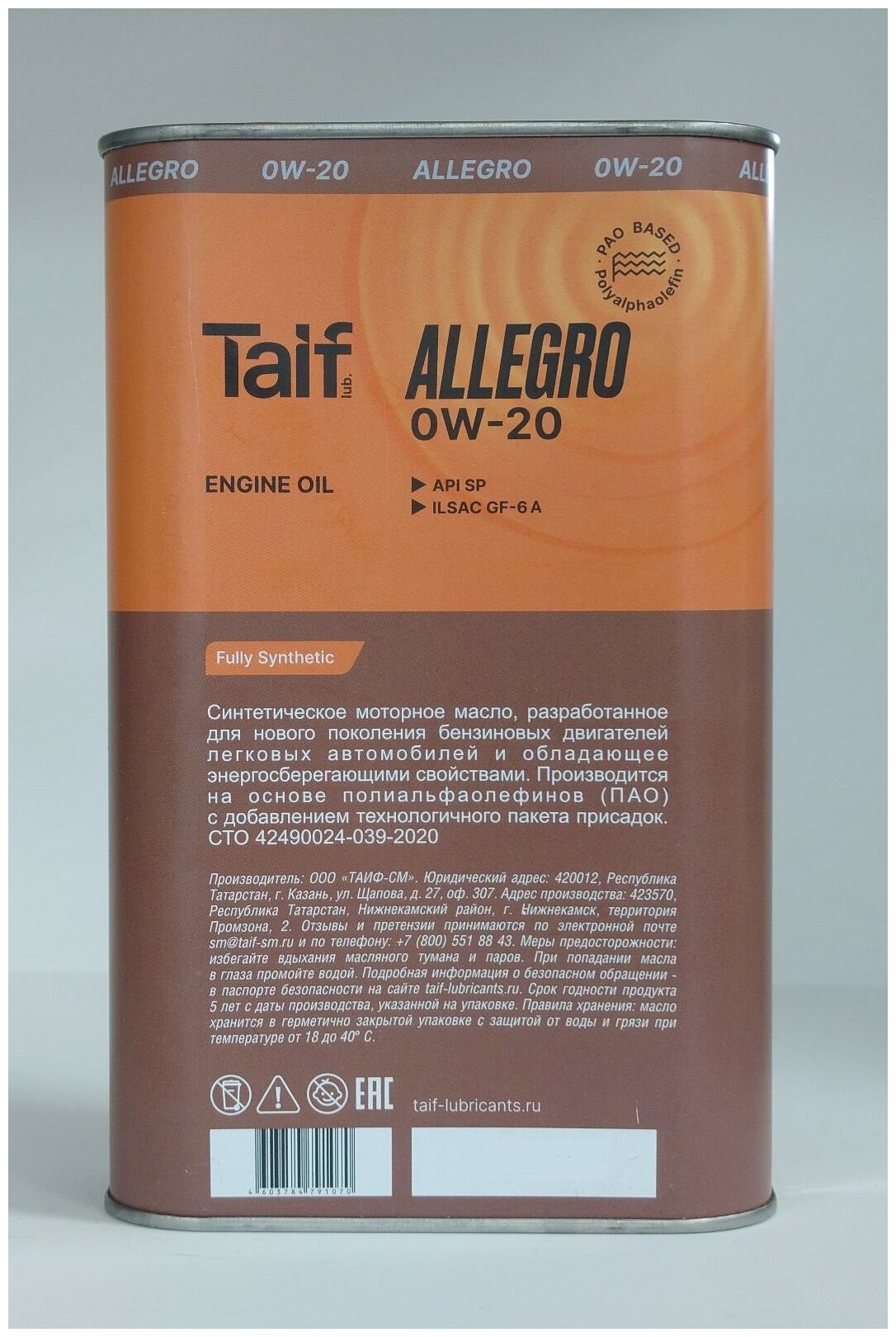 TAIF Lubricants Taif Allegro 0W-20 Масло Моторное Api Sp, Ilsac Gf-6А, 4 Л.