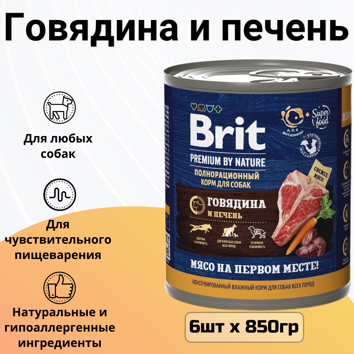 Влажный корм для собак Brit говядина, печень 6 шт. х 850 г