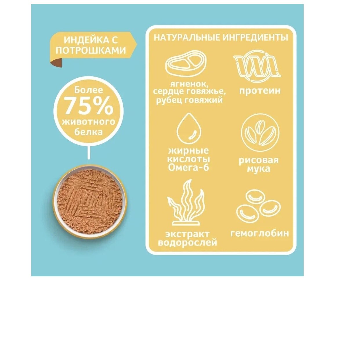 | Состав | индейка, потрошки индейки, рисовая мука, масло растительное, сухая сыворотка, гемоглобин, витаминно-минеральный комплекс, экстракт водорослей, дрожжевой экстракт |