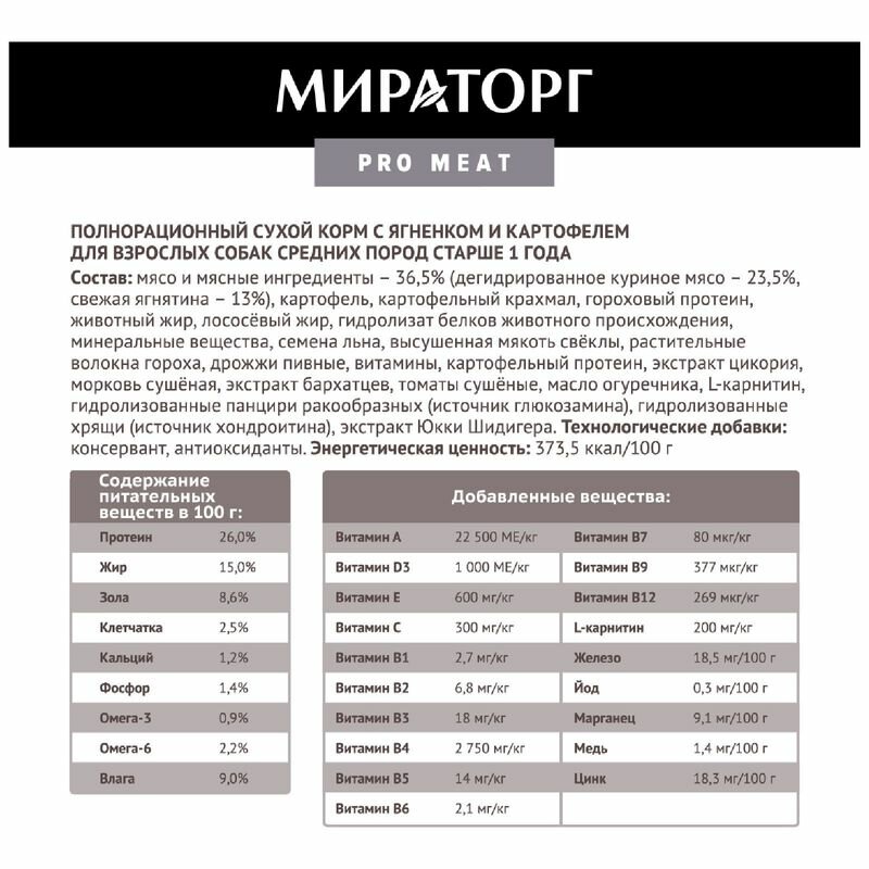 Полнорационный сухой корм мираторг PRO MEAT с ягненком и картофелем для взрослых собак средних пород старше 1 года 2,6 кг