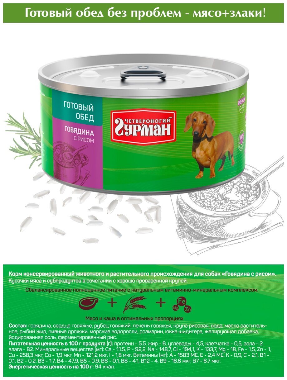 Четвероногий Гурман Готовый обед консервированный корм с говядиной и рисом для собак - 325 г (12 шт)