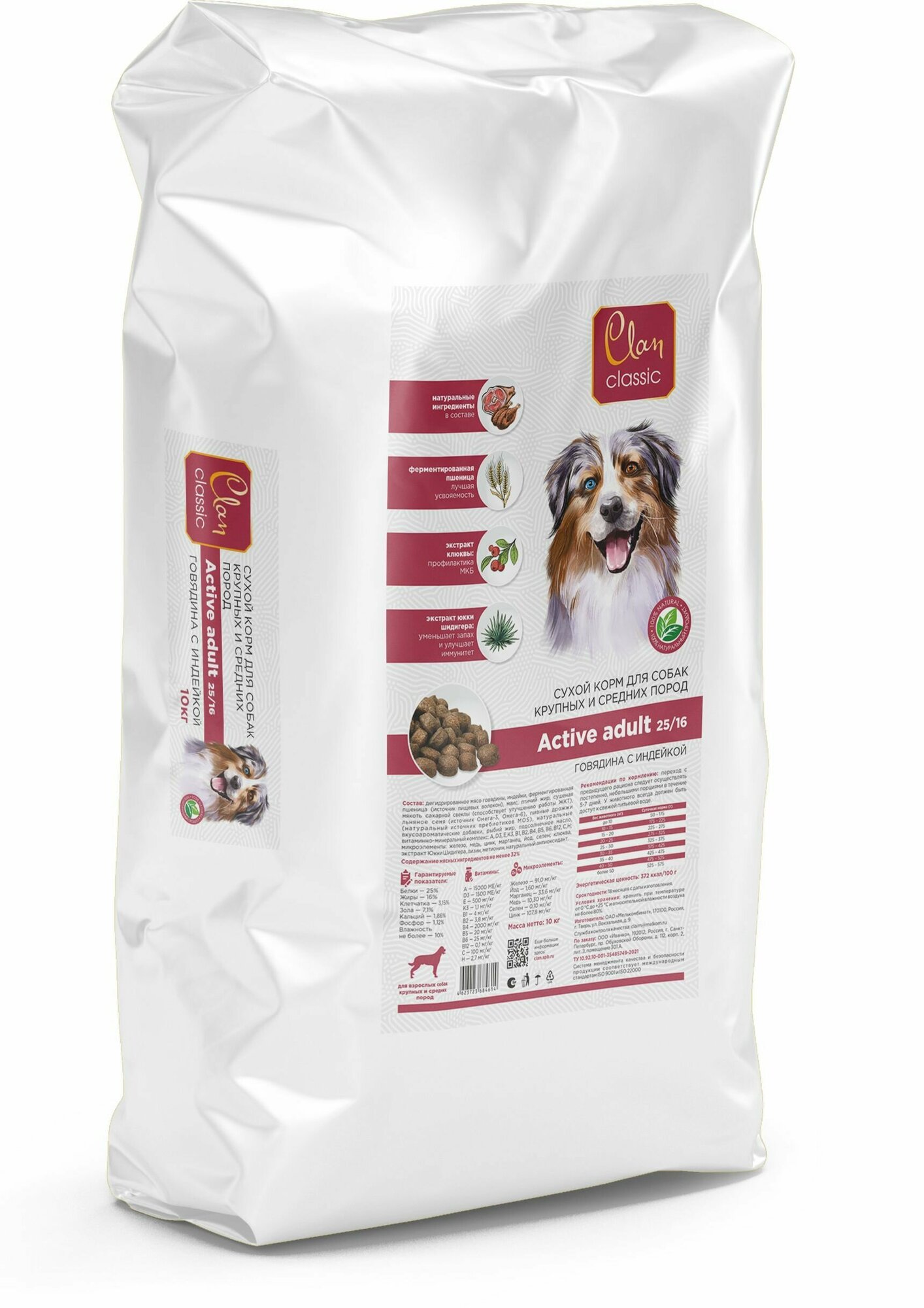 Clan Classic Active 25/16 - Сухой корм для активных собак средних и крупных пород, говядина /индейка (10кг)