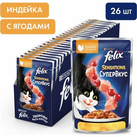 Купить Влажный корм для взрослых кошек Felix Sensations Супервкус с индейкой и ягодами в желе 26шт*75 г