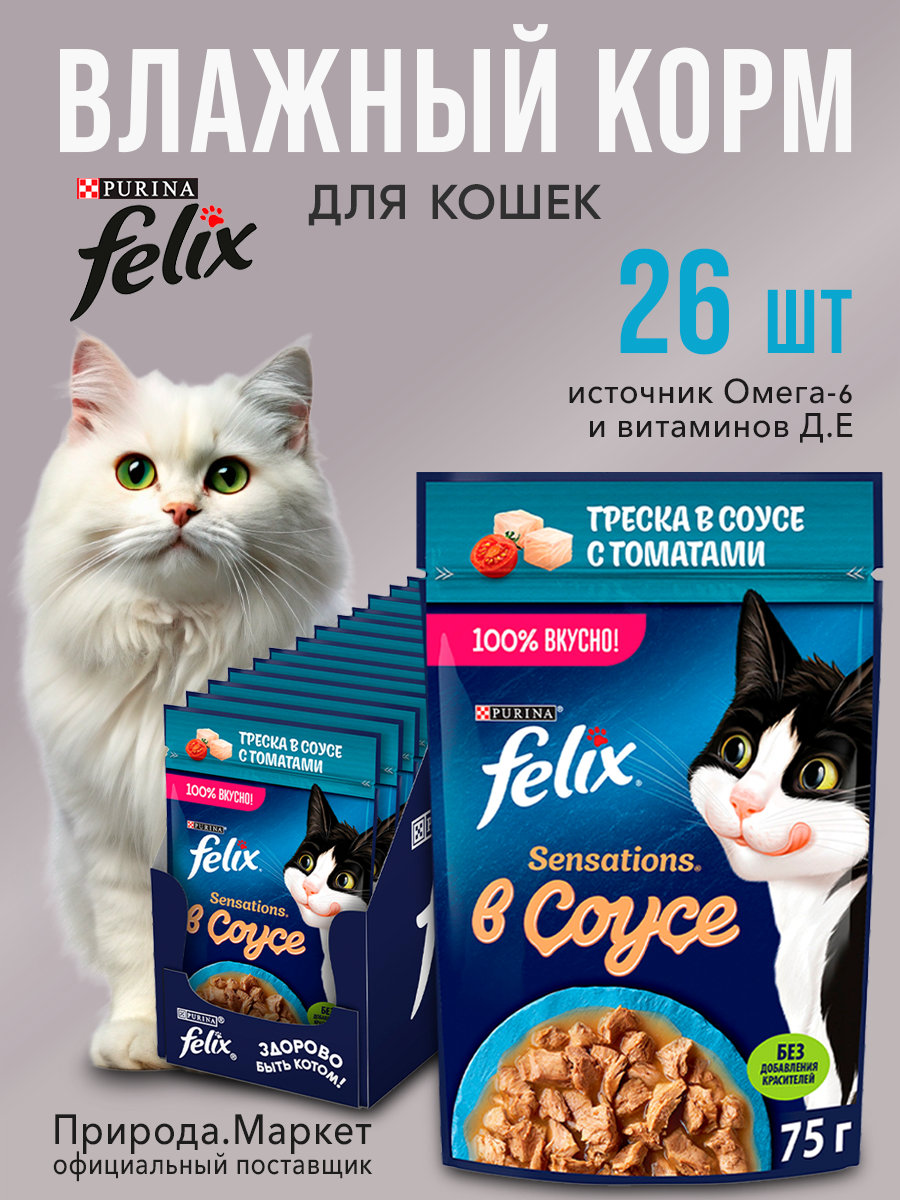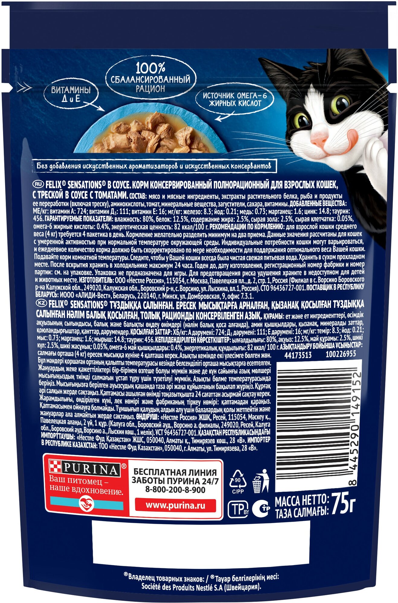 Купить Влажный корм для взрослых кошек Felix Sensations треска в соусе с томатами 75г x 26шт