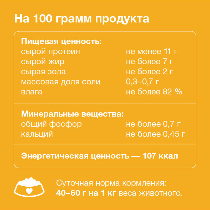 | Пищевая ценность | протеин - 11 %, жир - 7 %, соль - 0,4 %, зола - 2,0 %, влага - до 82 % |