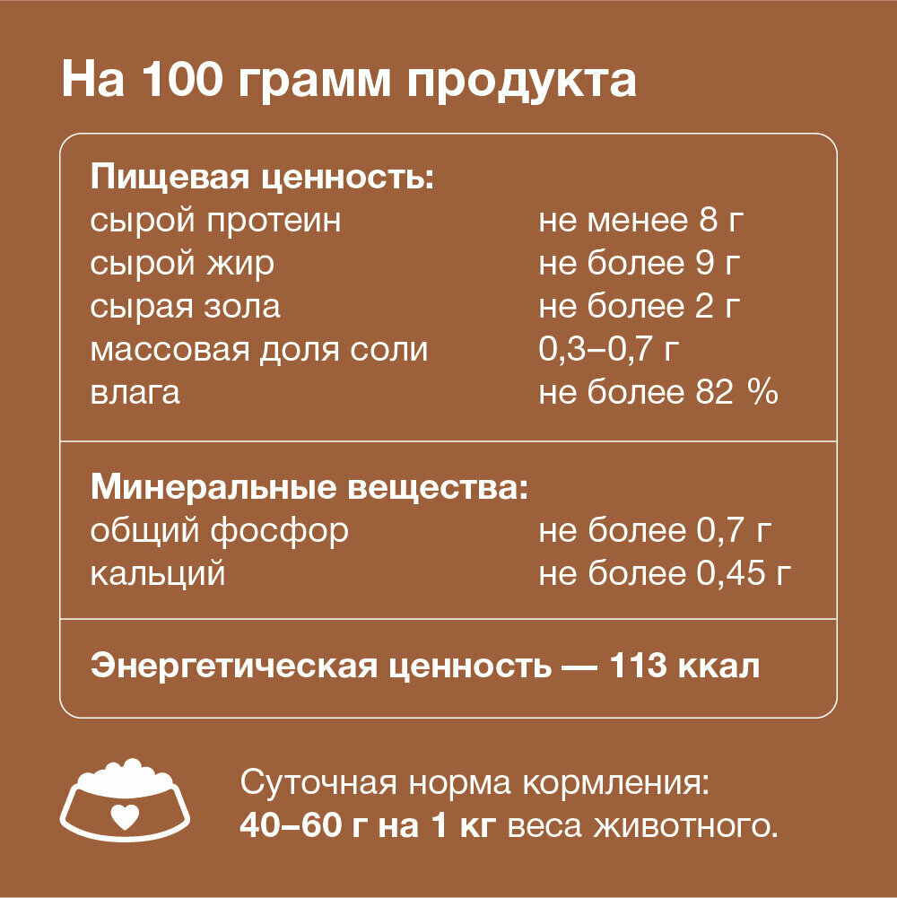 | Состав | мясо утки, мясо индейки, печень, сычуг, легкое, рубец, картофель, желирующая добавка, растительное масло, соль, вода |