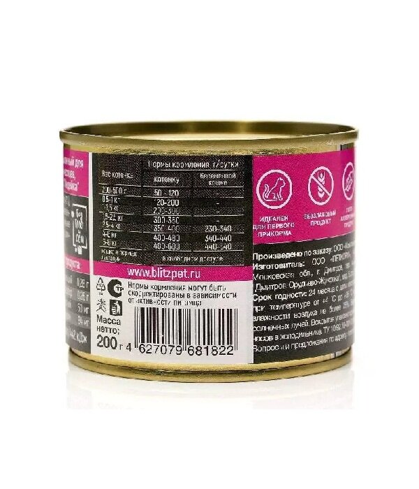 BLITZ Starter корм консервированный полнорационный для котят, беременных и кормящих кошек с индейкой нежное суфле, 200 г