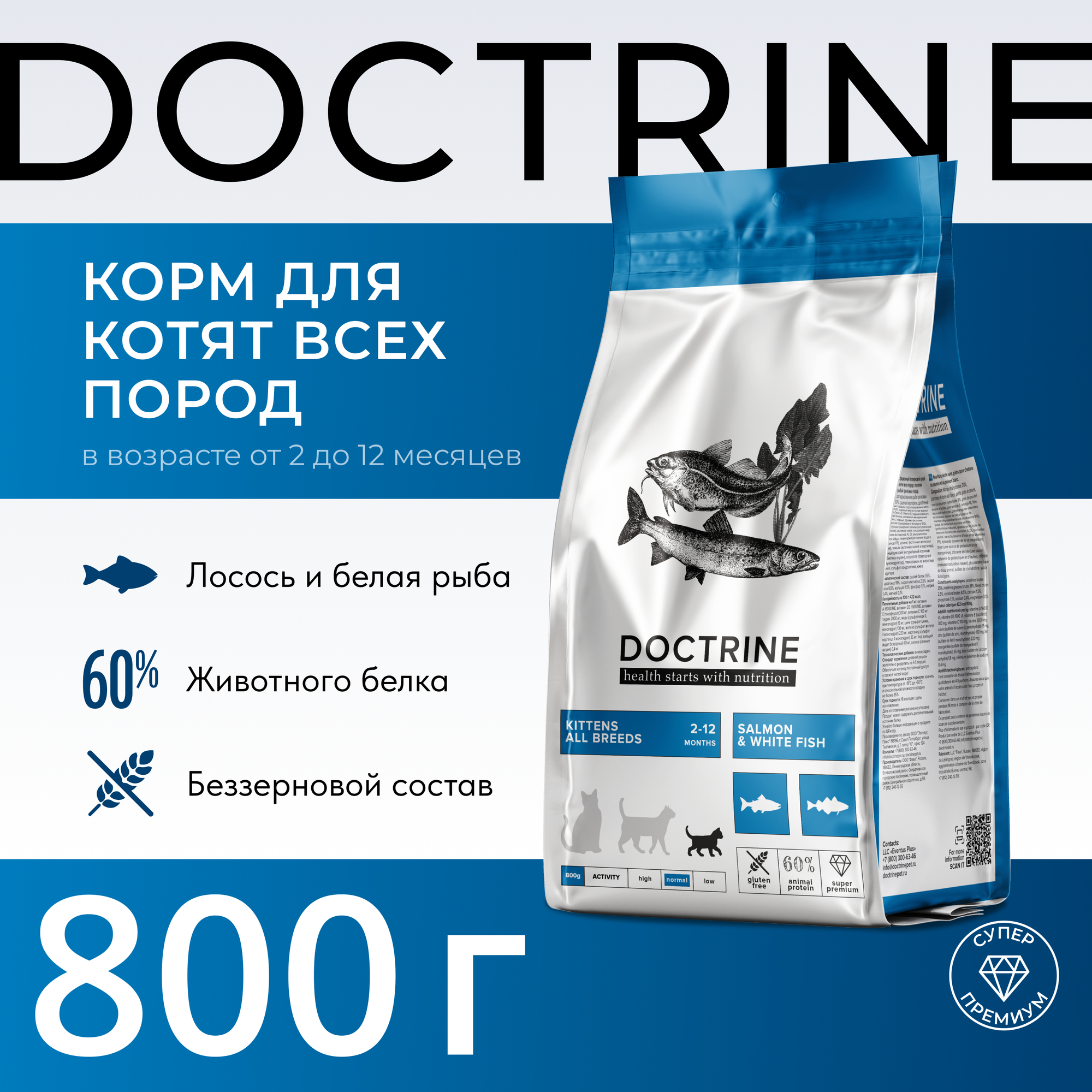 Сухой корм для котят Беззерновой DOCTRINE с лососем и белой рыбой 800г / доктрин, доктрина