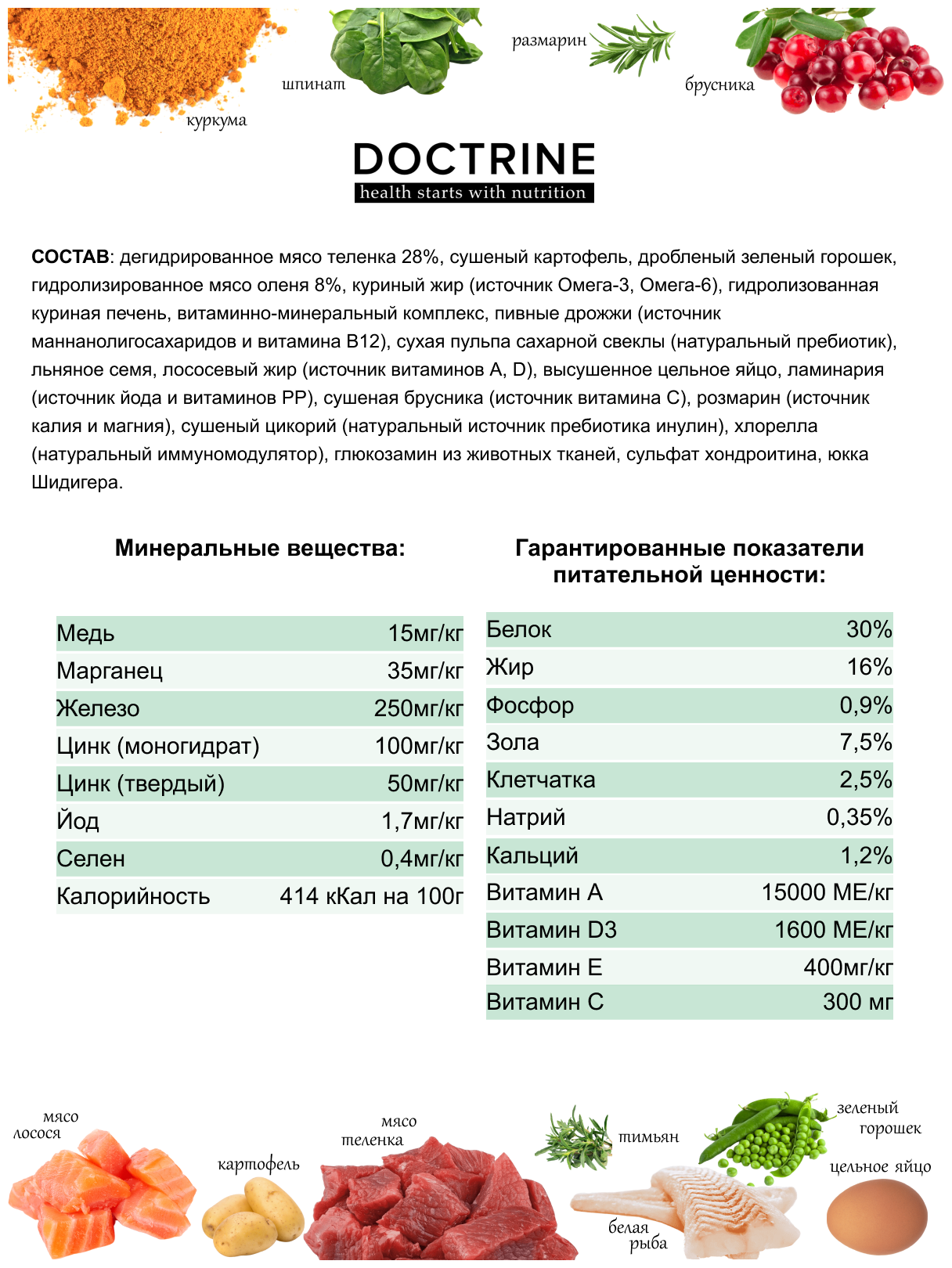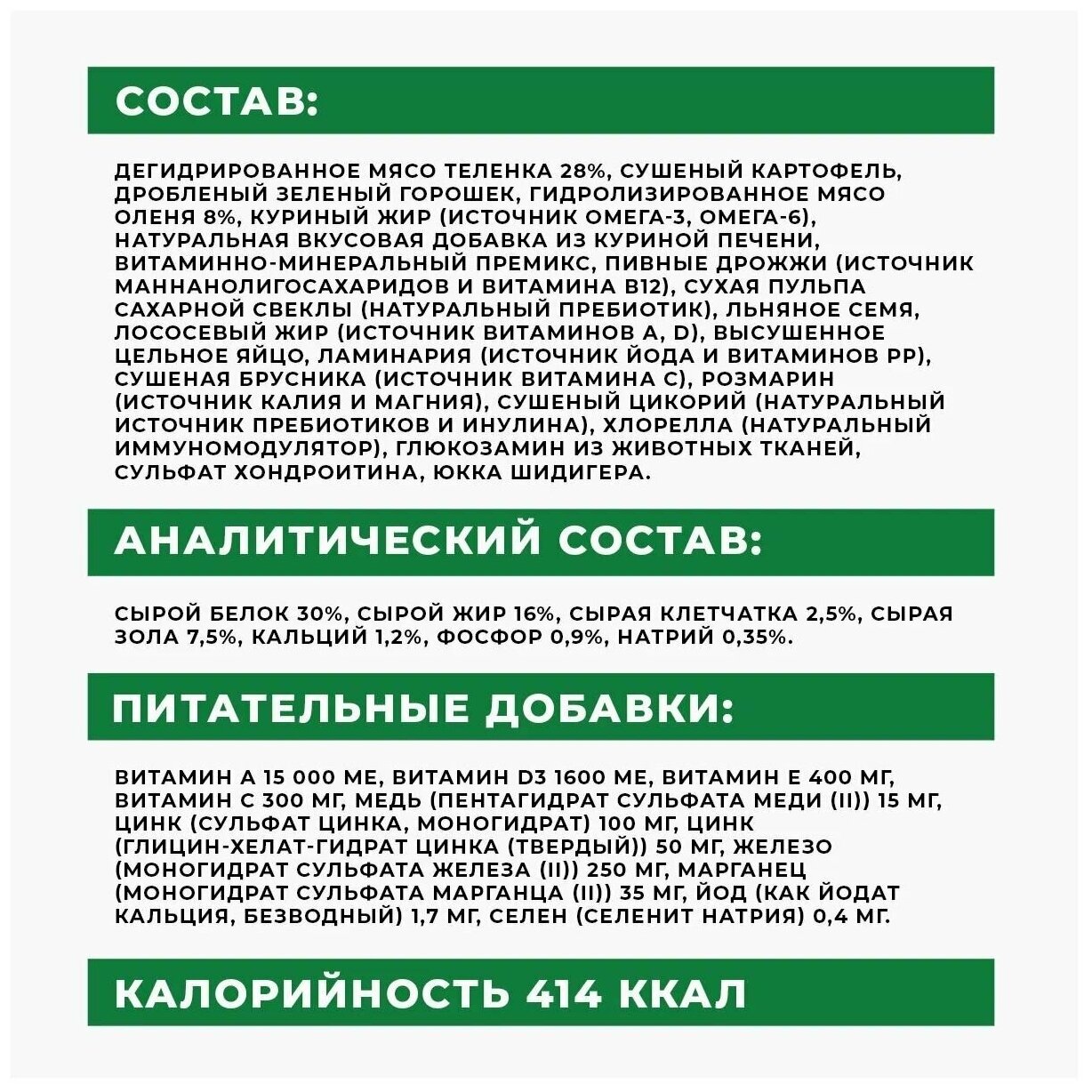 | Состав | дегидрированное мясо теленка 28%, сушеный картофель, дробленый зеленый горошек, гидролизированное мясо оленя 8%, куриный жир (источник Омега-3, Омега-6), натуральная вкусовая добавка из куриной печени, витаминно-минеральный премикс, пивные дрожжи (источник маннанолигосахаридов и витамина В12), сухая пульпа сахарной свеклы (натуральный пребиотик), льняное семя, лососевый жир (источник витаминов А, D), высушенное цельное яйцо, ламинария (источник йода и витаминов РР), сушеная брусника (источник витамина С), розмарин (источник калия и магния), сушеный цикорий (натуральный источник пребиотиков и инулина), хлорелла (натуральный иммуномодулятор), глюкозамин из животных тканей, сульфат хондроитина, юкка Шидигера |