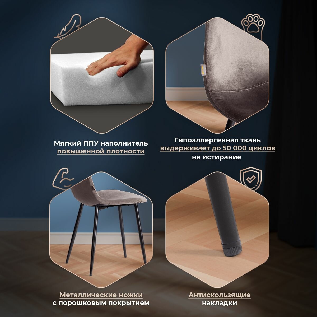 Стул BREEZE (mod. 4724) Велюр/металл , 44 х 53 х 87 см, Light grey (светло-серый) HLR14 / натуральный (Комплект из 4 шт.)