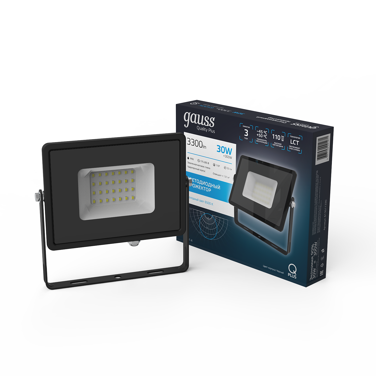 Прожектор Gauss Qplus 30W 3000lm 6500K 175-265V IP65 черный LED