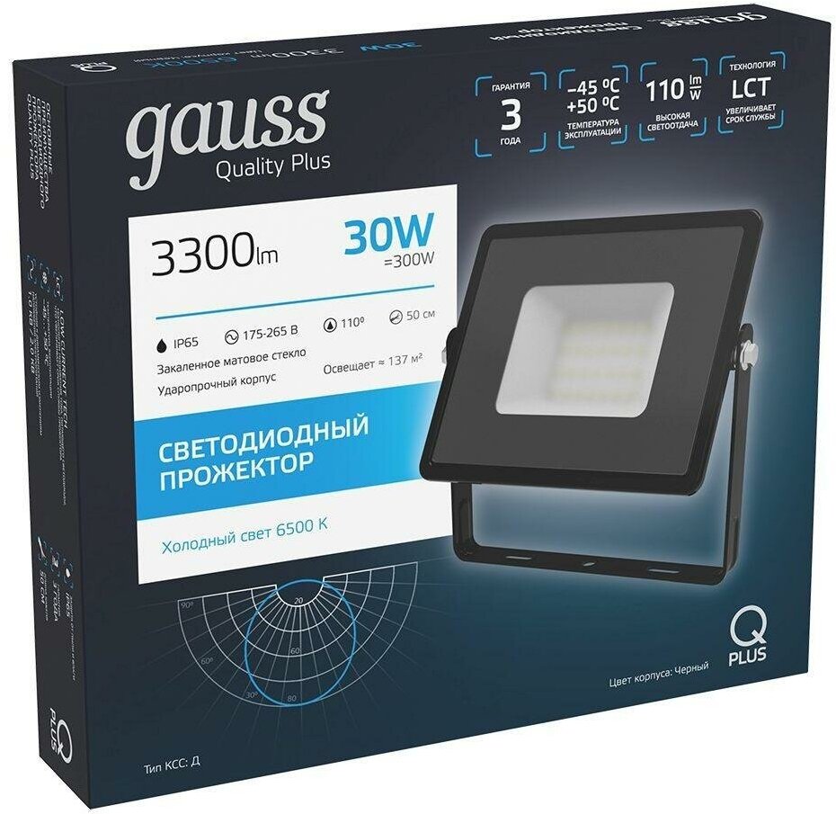 Прожектор Gauss Qplus 30W 3600lm 6500K 175-265V IP65 черный LED 1/10