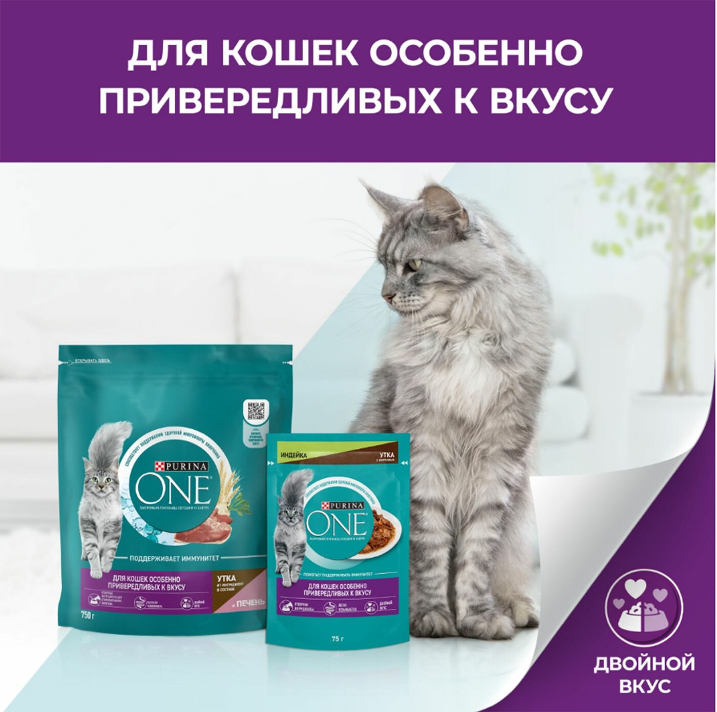 PURINA ONE для взрослых кошек особенно привередливых к вкусу с индейкой, уткой и морковью пауч 75 гр 75 гр х 5 шт