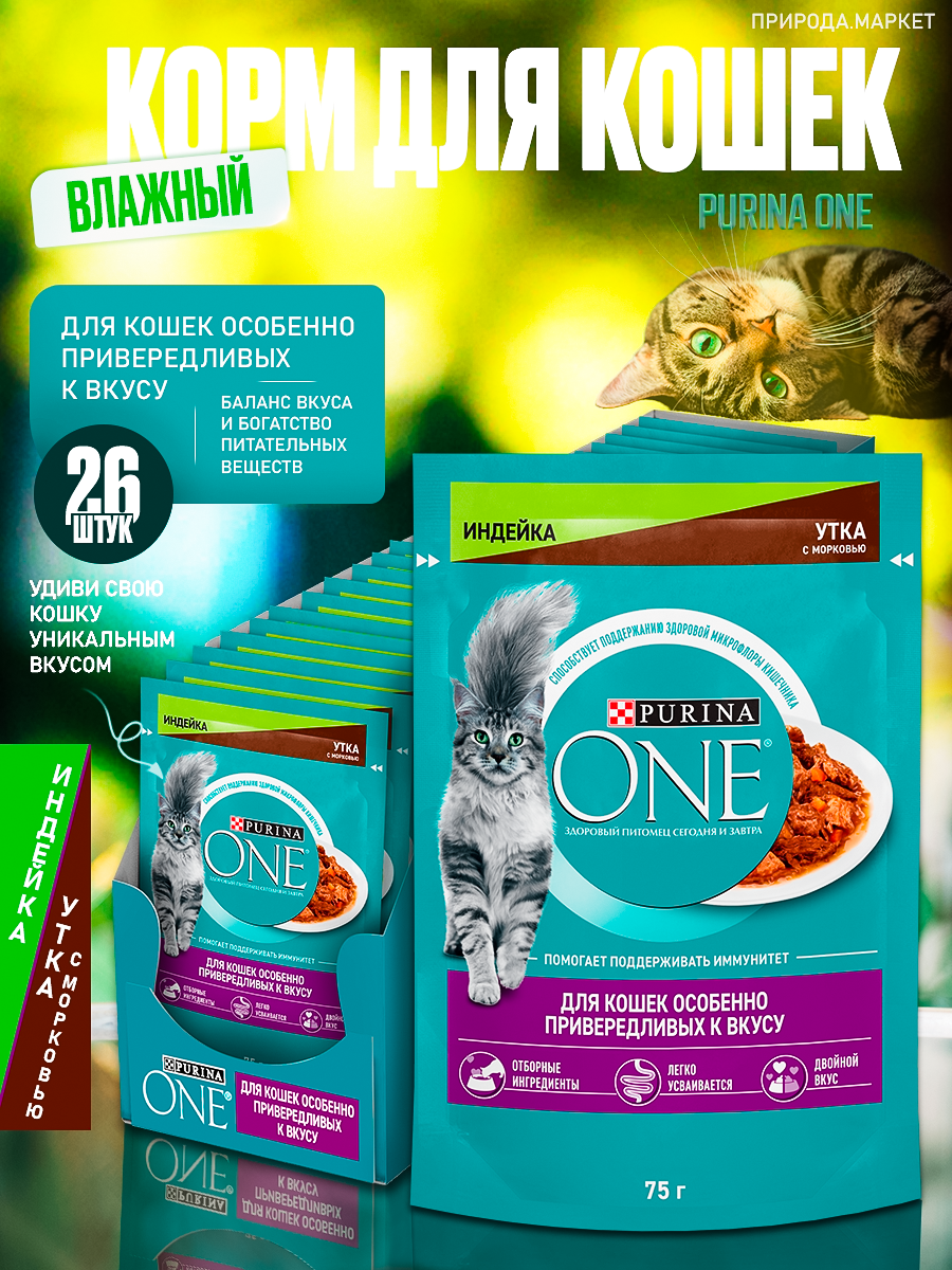 Purina ONE 75 г пауч влажный корм для кошек особенно привередливых к вкусу, с индейкой , уткой и морковью х26 штук