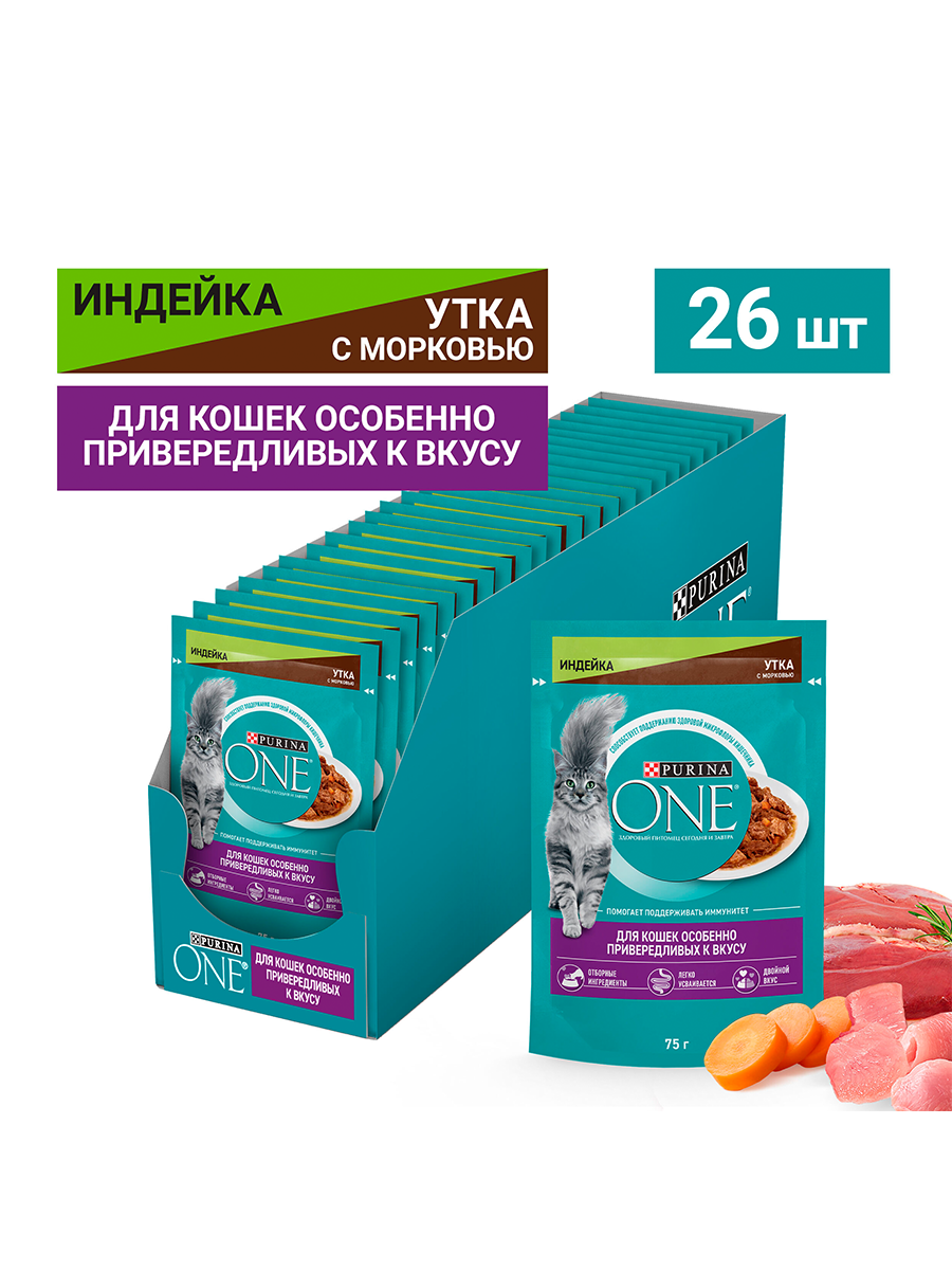 Купить Влажный корм для кошек Purina One особенно привередливых ко вкусу с индейкой, уткой и морковью 26шт*75г