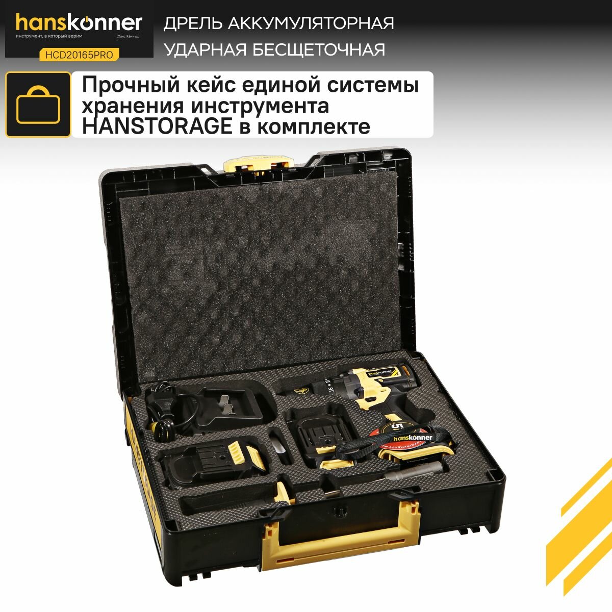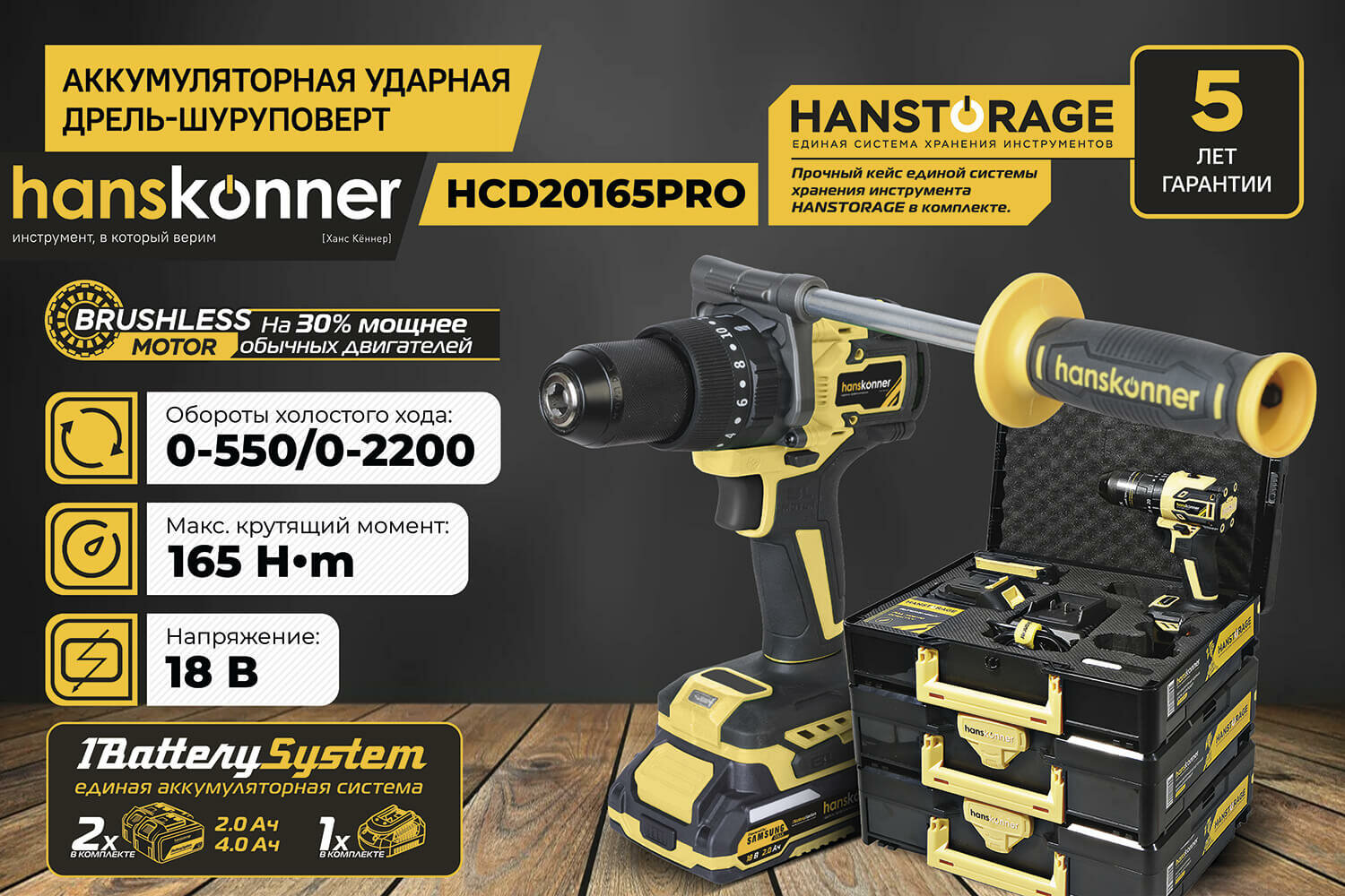 Купить Аккумуляторный шуруповерт Hanskonner HCD20165PRO 1BatterySystem (18 В, 165 Нм, 2.0+4.0 Ач, SAMSUNG, 13мм, кейс HS)