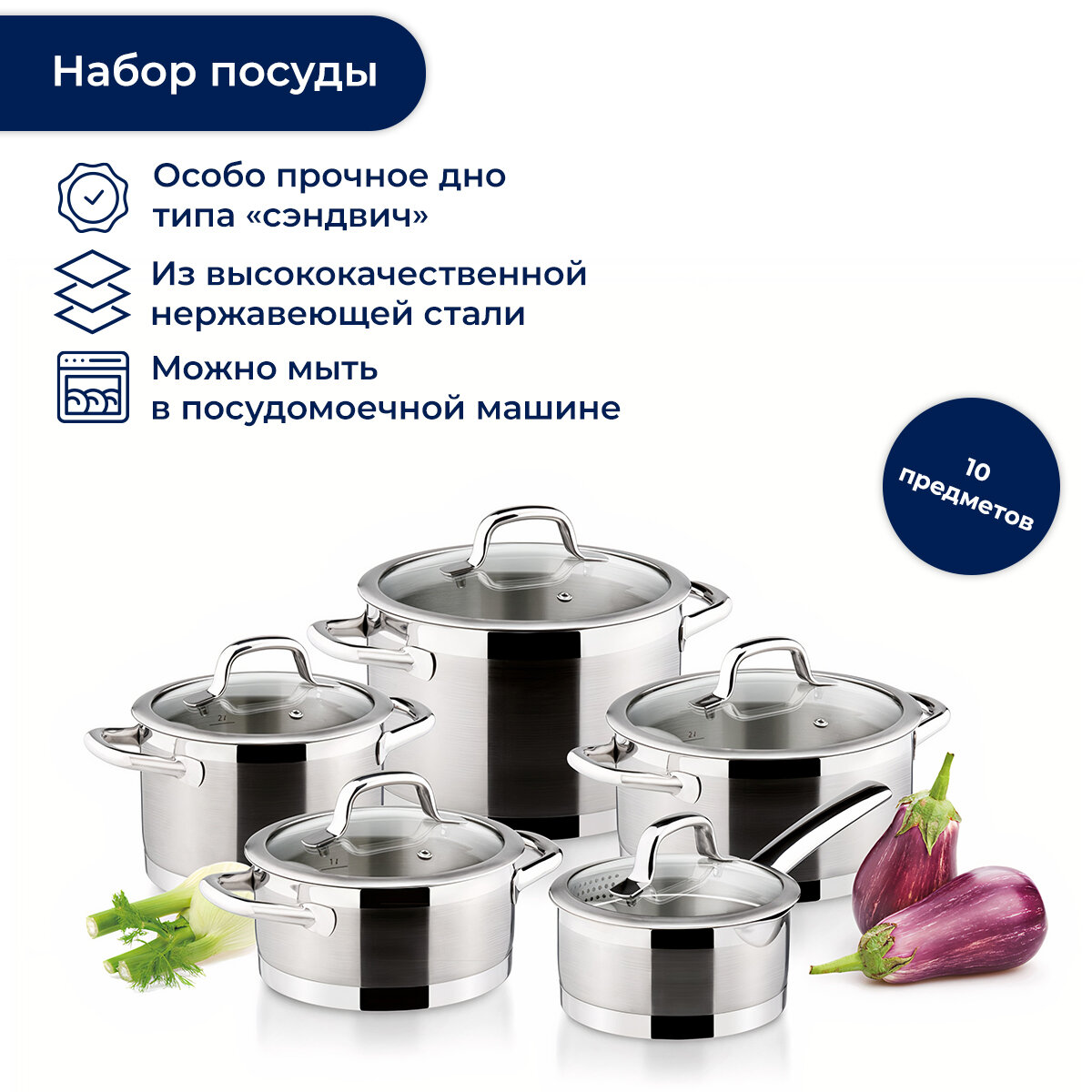 | Комплектация | 4 кастрюли: 5.5 л, 4 л, 3 л, 2 л; ковш: 1.5 л; 5 крышек |