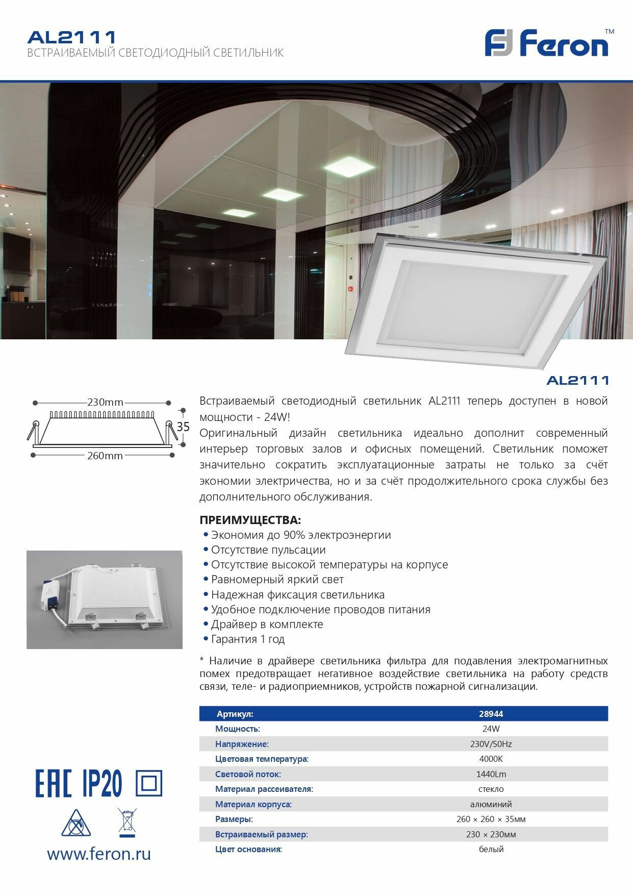 Feron Свет-ник встраиваемый светодиод 24W, 1640Lm, 4000K, белый, AL2111 28944 .