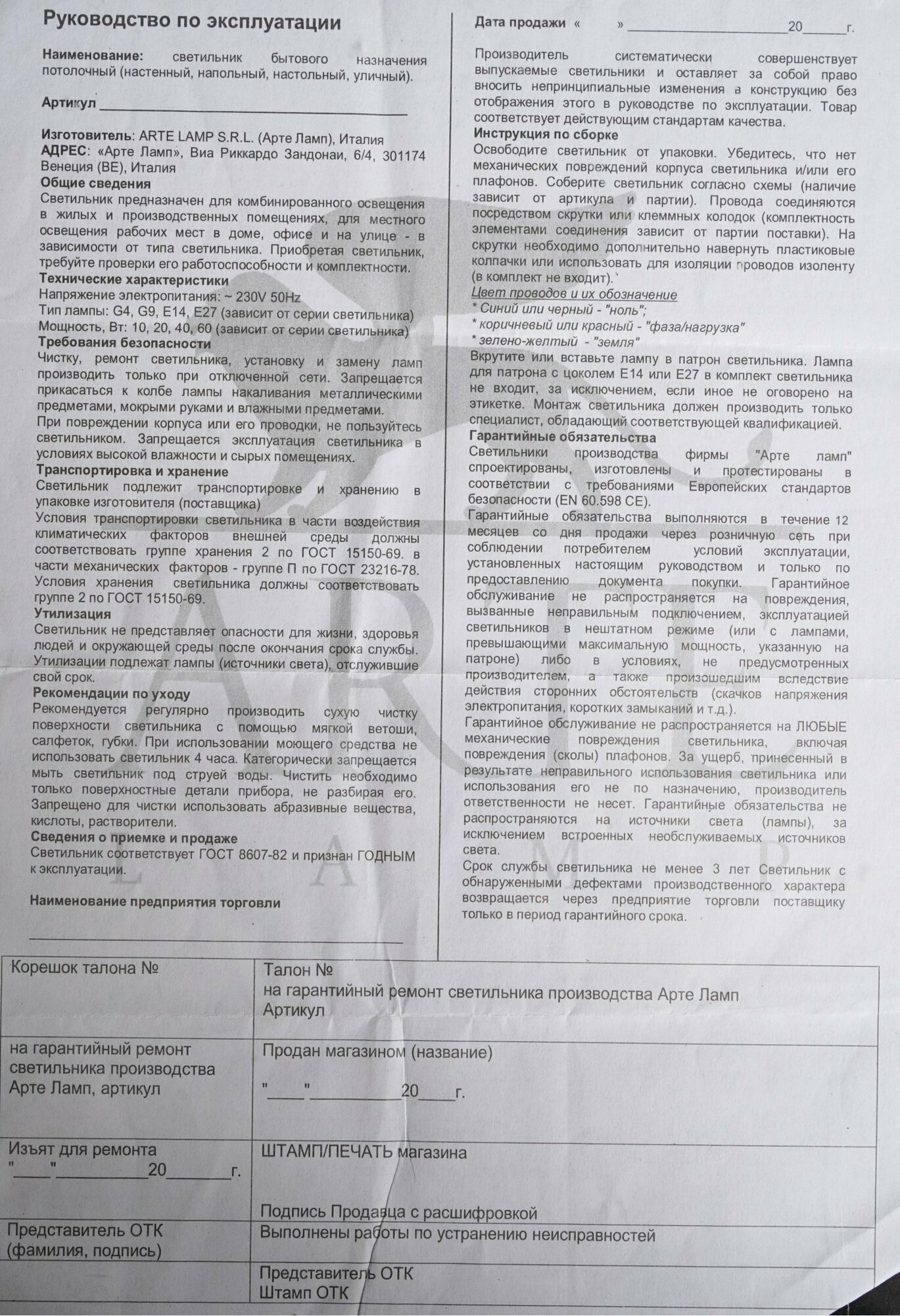 | Подробная комплектация | Arte Lamp A3214PL-1WH |