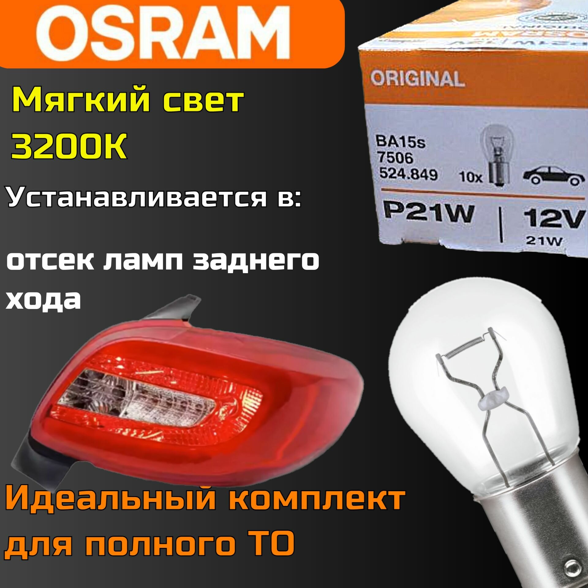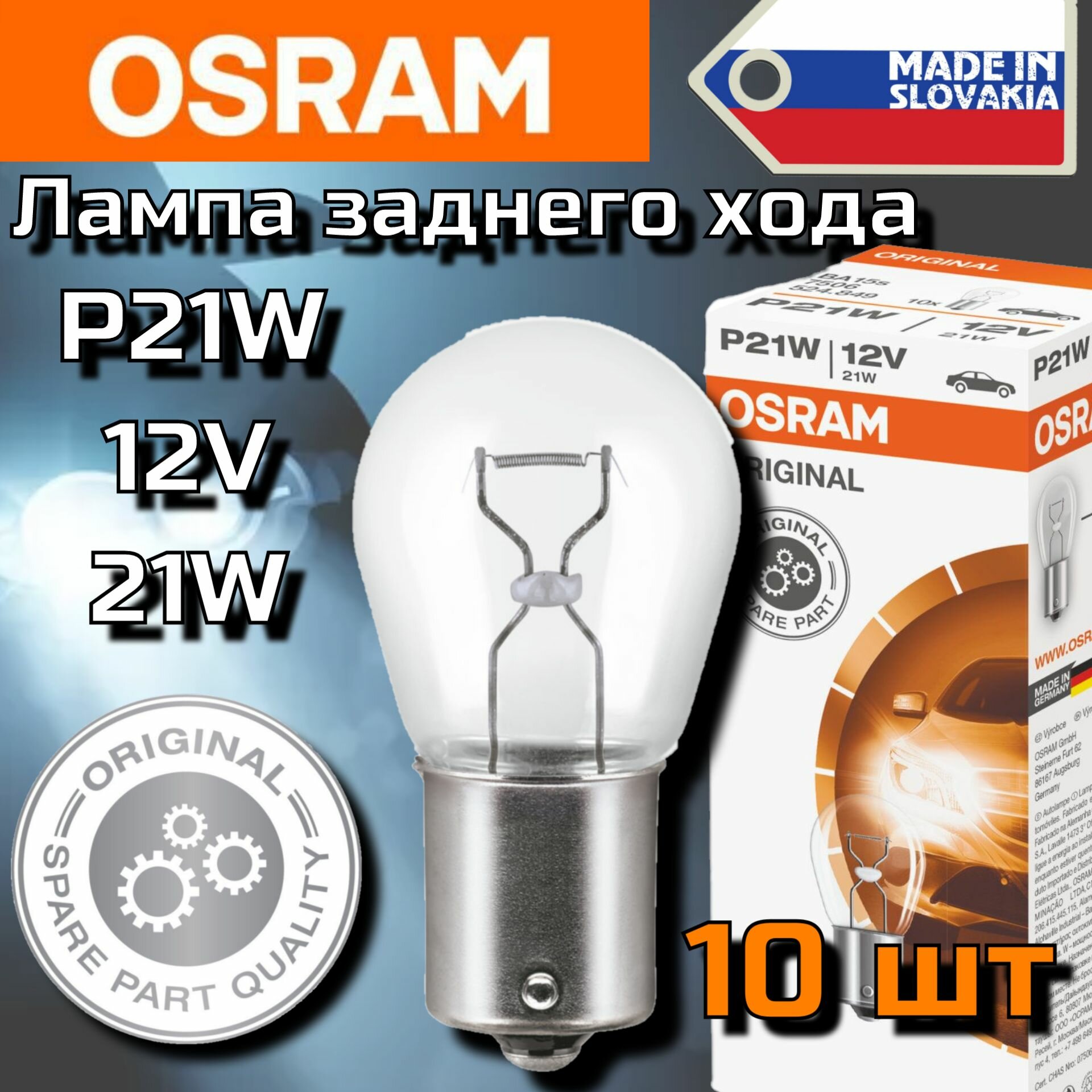 Лампы автомобильные OSRAM 7506 P21W (BA15s) (10шт) 12V , лампы заднего хода