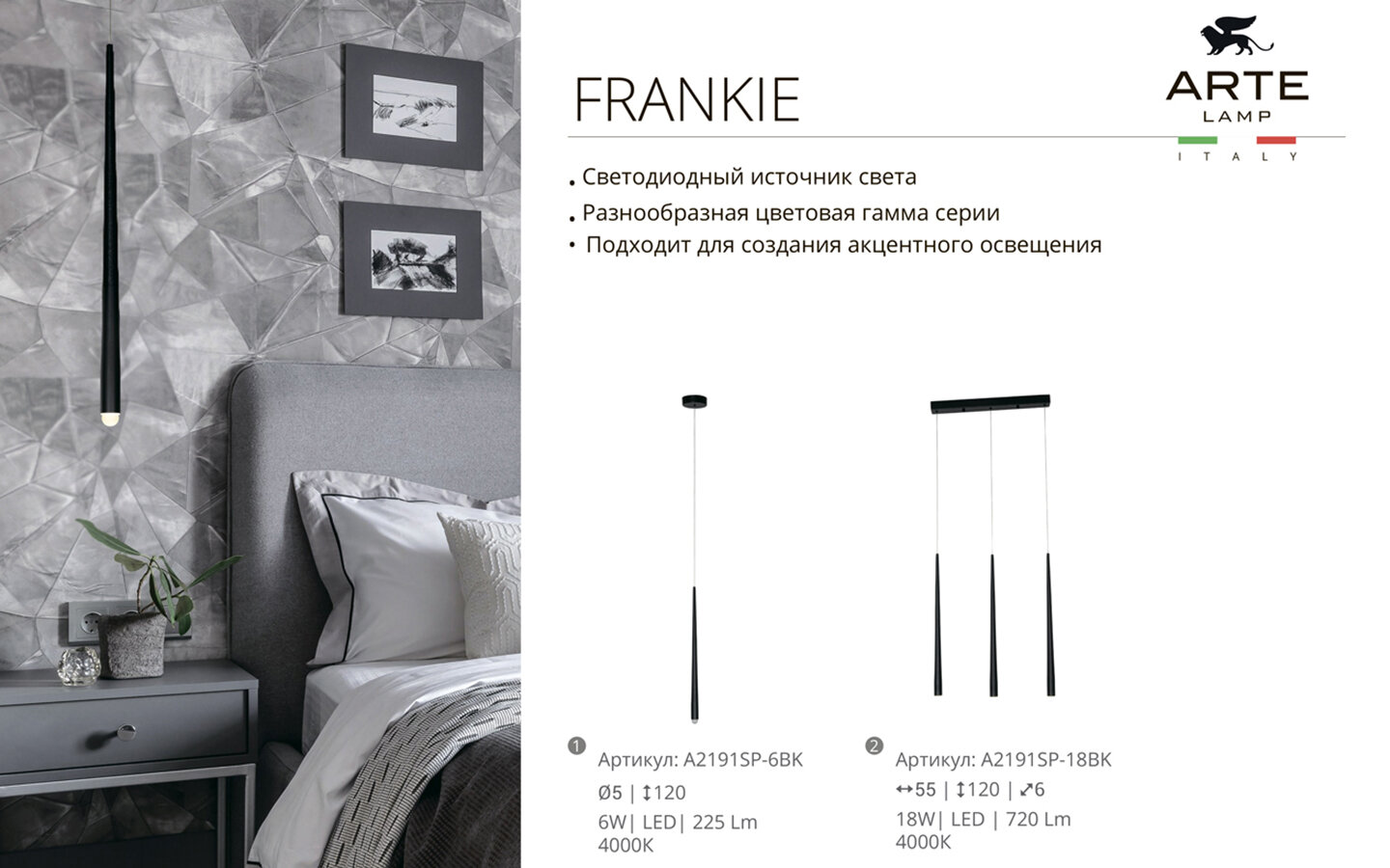 Ниже Вы можете прочитать отзывы на Точечный подвесной светильник Arte Lamp FRANKIE A2191SP-6BK, ознакомится с подробными характеристиками, посмотреть интересные обзоры и фотографии на Точечный подвесной светильник Arte Lamp FRANKIE A2191SP-6BK.