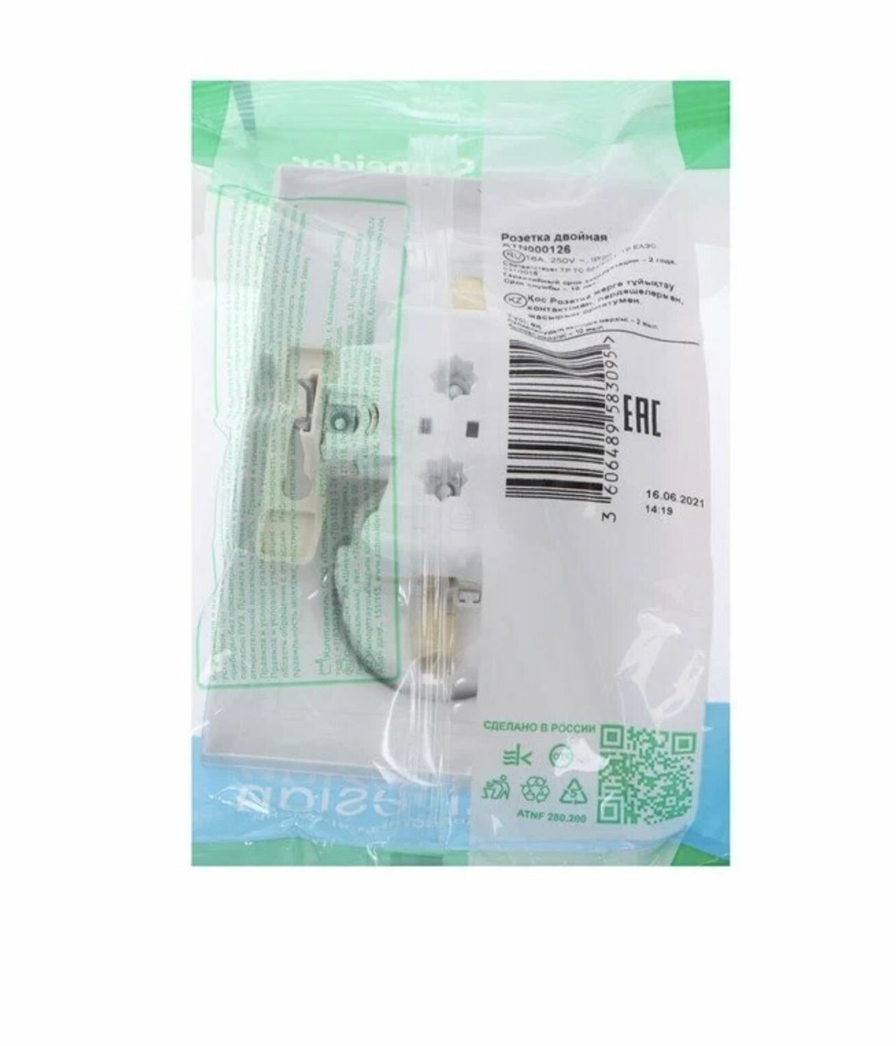 "Евророзетка двойная с антибактериальным покрытием с заземлением со шторками Schneider Electric ATLASDESIGN, 16А, в сборе, IP20, белый."