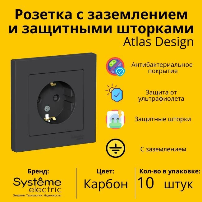 Розетка с заземлением со шторками с рамкой 10 шт Schneider Electric/Systeme Electric AtlasDesign 16А одинарная карбон шнайдер ATN001044