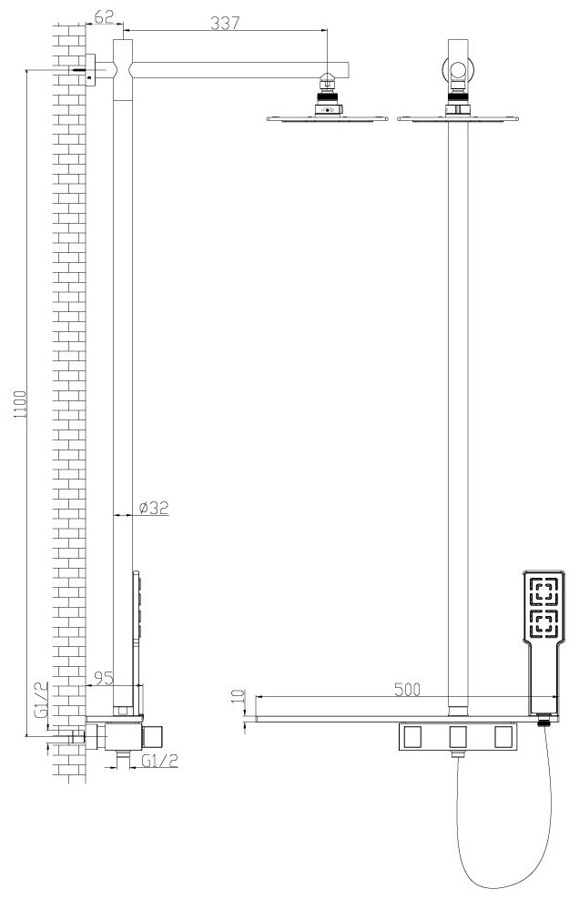 | Дополнительная информация | высота стойки для душа: 1100 мм; длина верхнего душа: 203 мм; ширина верхнего душа: 203 мм |