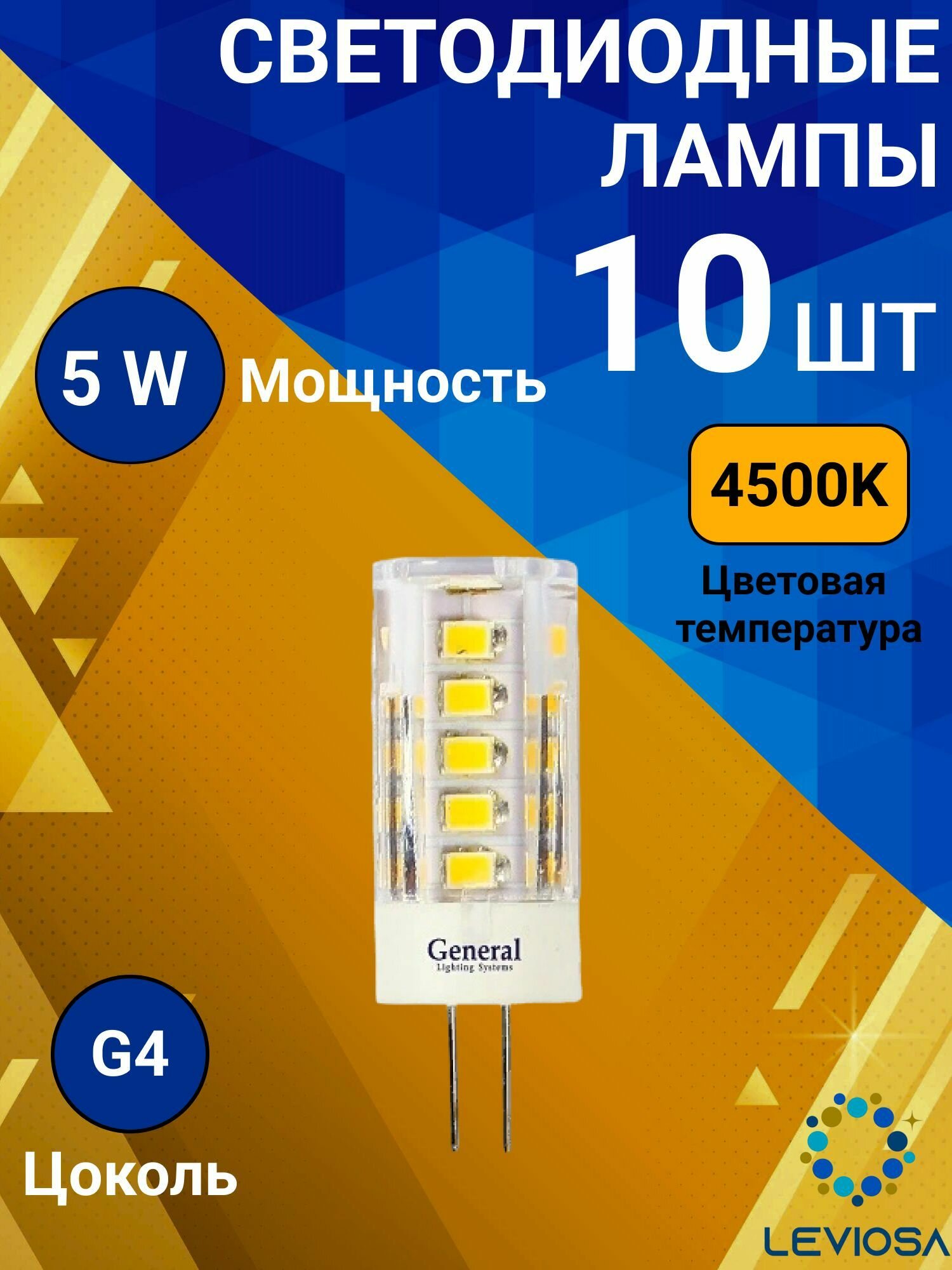 Светодиодные лампы 12 вольт, General, Комплект из 10 шт., Мощность 5 Вт, Цоколь G4, Теплый свет