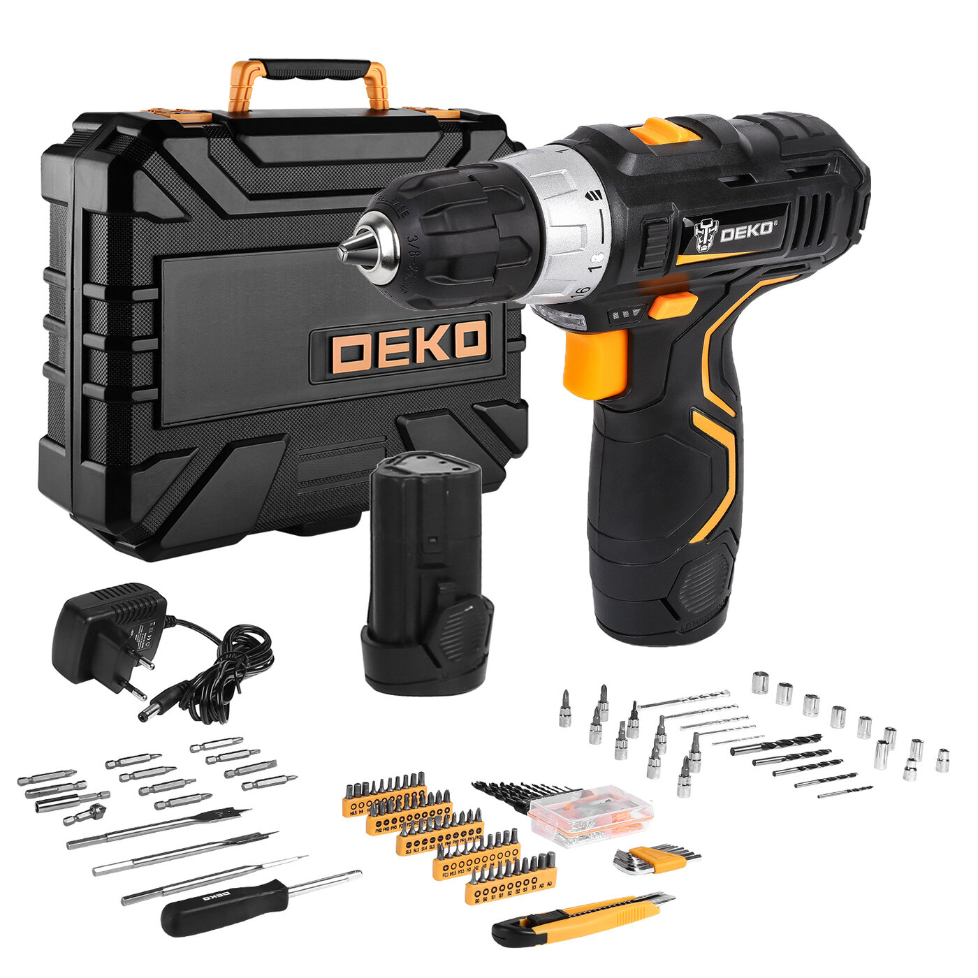 Дрель-шуруповерт аккумуляторная DEKO GCD12DU3 2*1.5Ah 12В, набор 193 аксессуара, в кейсе
