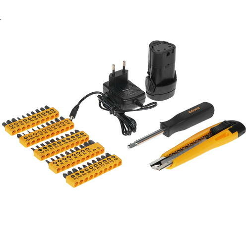 | Подробная комплектация | шуруповерт, сверло 3 шт, магнитный держатель для бит 60 мм, адаптер, нож строительный, зенкер, биты 50 мм 10 шт, набор крепежа 79 шт, биты со вставкой 9 шт, отверточная рукоятка, торцевая головка 9 шт, удлинитель, биты 25 мм 50 шт, сверло 5 шт, сверло 10 шт, аккумулятор 2 шт, документация, зарядное устройство, кейс |