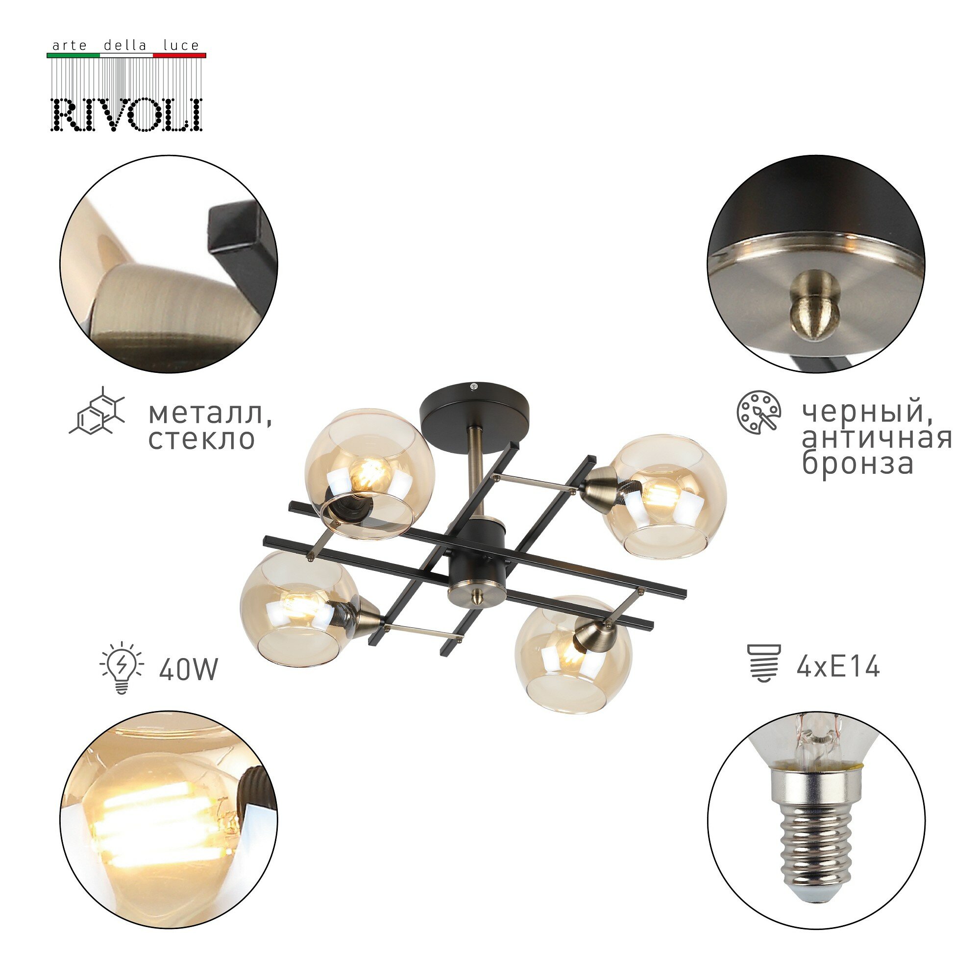 Люстра потолочная Rivoli Gitte под лампы 4хЕ14 40 Вт черный, медь дизайнерская 12м2