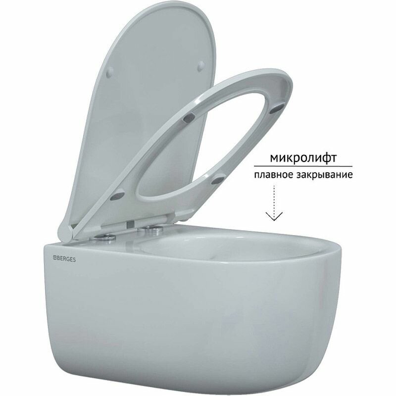 Комплект Berges для монтажа подвесного унитаза: инсталляция Novum525, кнопка L1 , унитаз EGO Rimless, сиденье дюропласт Okus Slim SO, микролифт, быстросъем