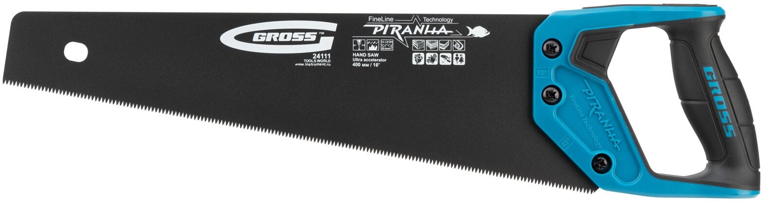 Ножовка по дереву Gross PIRANHA 400 мм, 11-12 TPI, кал.3D-зуб, тефл. покр. полотна, 2-х комп. рук-ка 24111