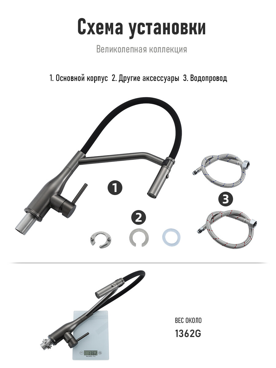 | Комплектация | смеситель - 1 шт; Гибкая подводка - 2 шт; монтажный комплект - 1 |
