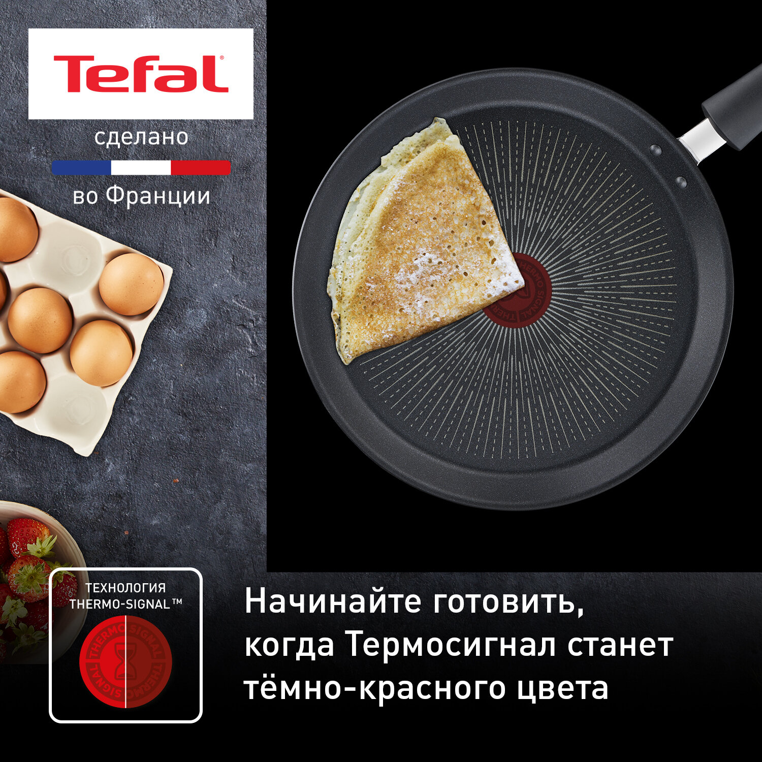 Блинная сковорода Tefal Excellence 25 см, с индикатором температуры, подходит для индукции, сделано во Франции