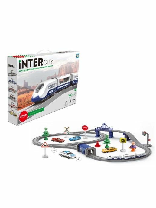 Купить Детская железная дорога с электропоездом 1TOY InterCity, со звуком, паровоз на рельсах, в подарочном наборе, 70 деталей