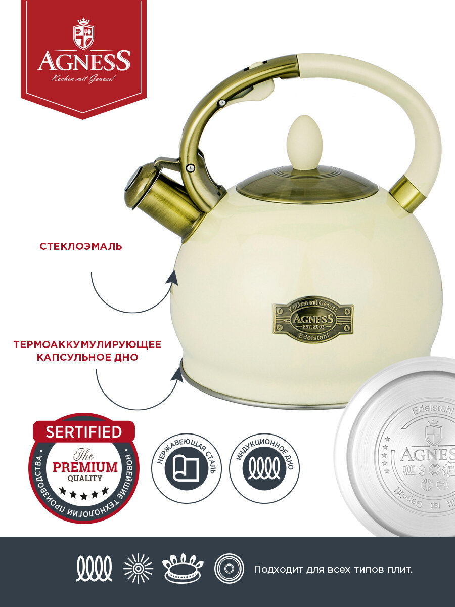 Чайник agness со свистком, серия тюдор, 3,0 л термоаккумулирующее дно, индукция