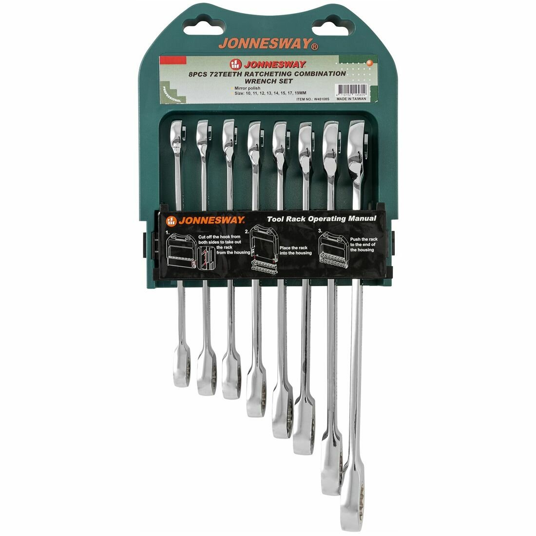 Набор ключей комбинированных трещоточных на пластиковом держателе, 10-19 мм, 8 предметов, W45108S, Jonnesway