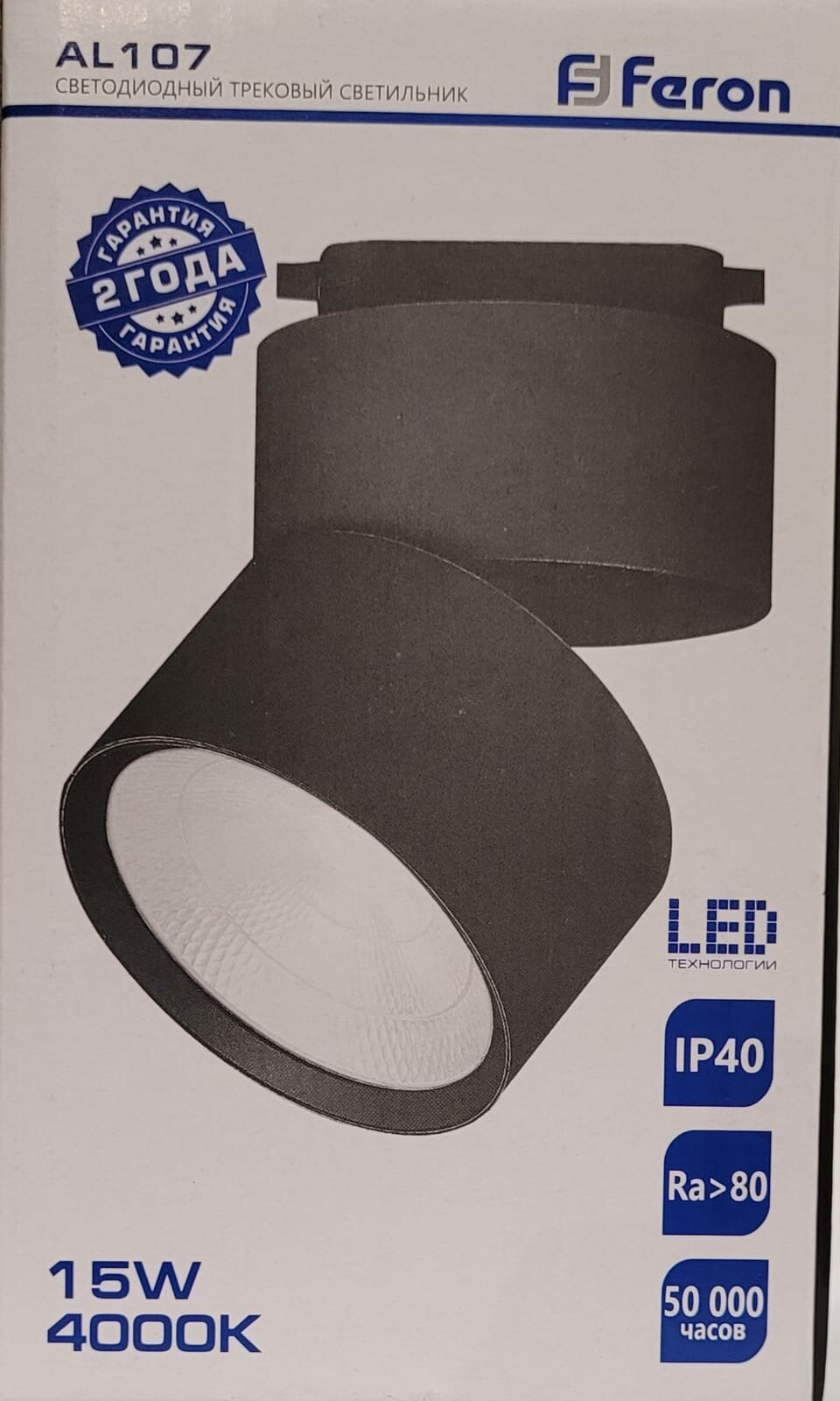 Светодиодный светильник Feron AL107 трековый однофазный на шинопровод 15W, 90 градусов, 4000К, черны