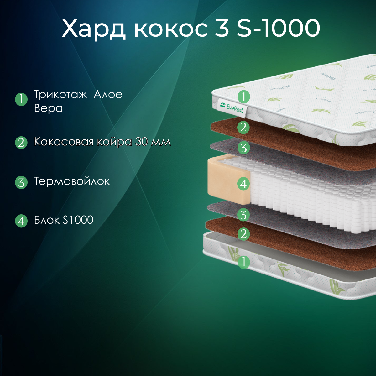 Матрас Everest Хард Кокос 3 S1000 - высокая жесткость, высота 20 см, до 130 кг, независимый блок 1000 пружин, чехол алое вера 150х185
