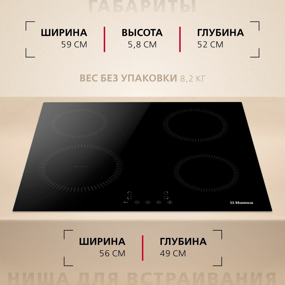 Индукционная электрическая варочная панель Hansa BHI683200, встраиваемая, 60 см, функция блокировки управления, звуковой таймер, стеклокерамическая поверхность с сенсорным управлением