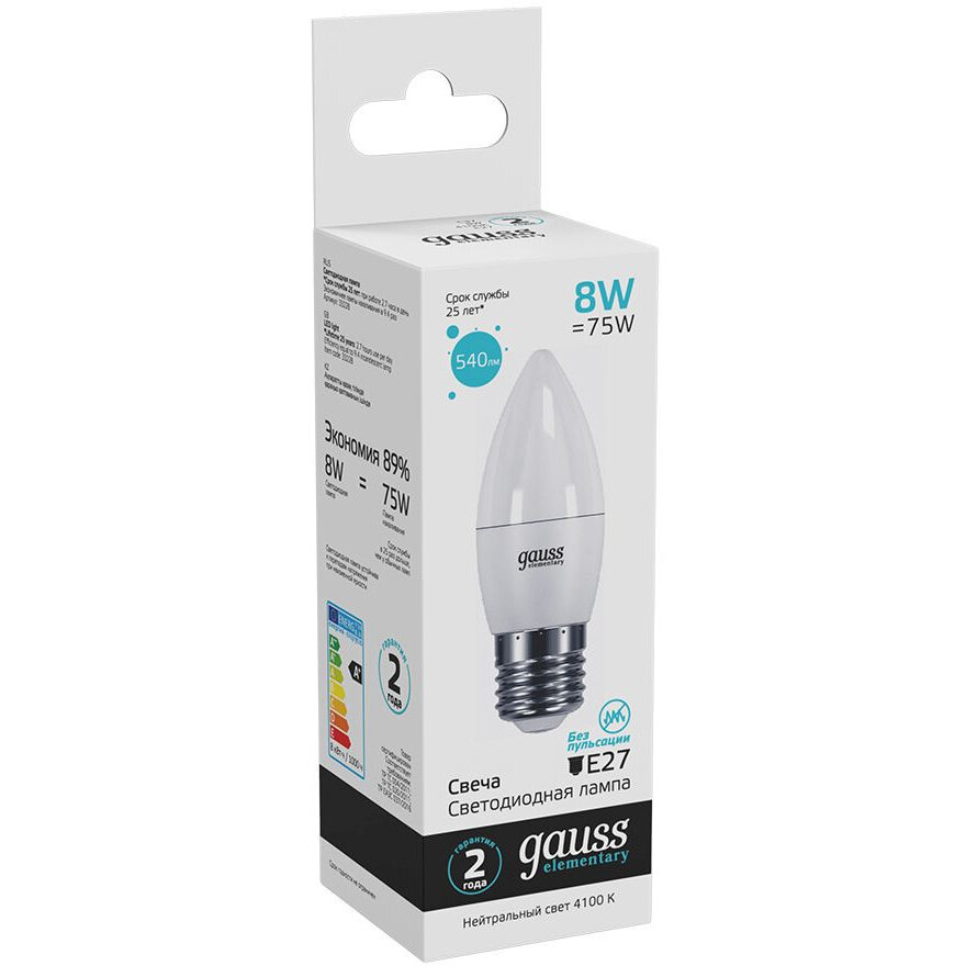 Лампочка светодиодная E27 свеча 8W нейтр-белый свет 4100K упаковка 10 шт. Gauss Elementary