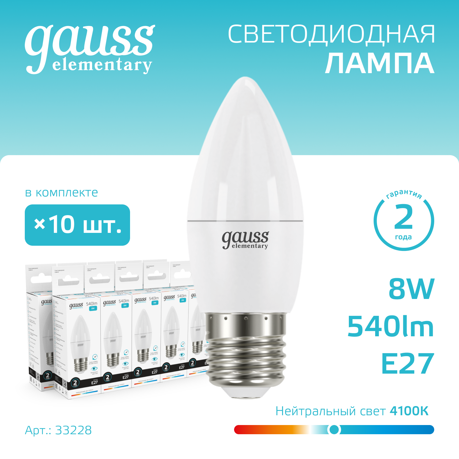 Упаковка светодиодных ламп 10 шт Gauss Elementary Свеча 8W 540lm 4100K Е27 LED 33228
