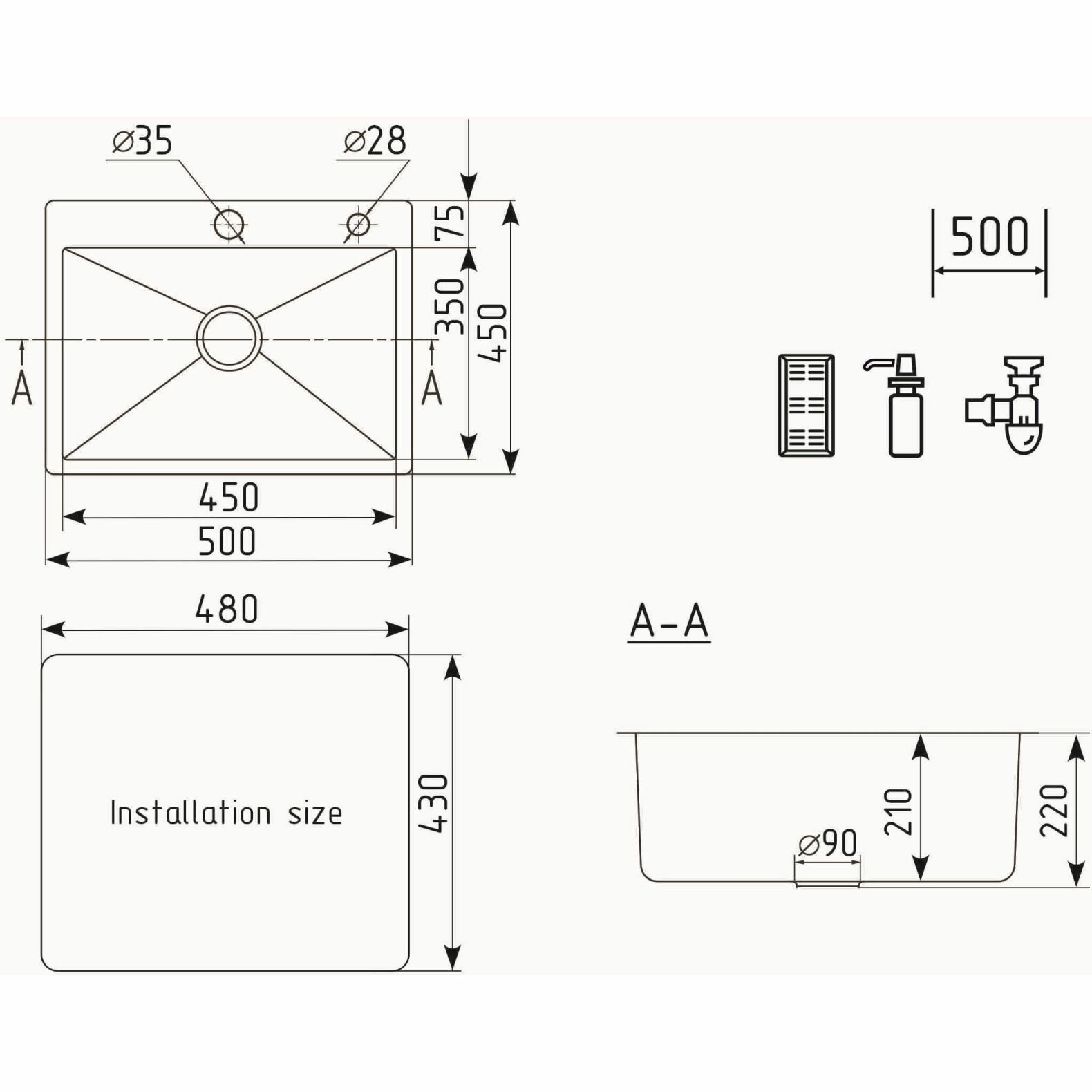 | Дополнительная информация | дозатор в комплекте; толщина стали: 3 мм (крыло), 1,2 мм (чаша); установочный проем 480 х 430 мм; отверстие под смеситель 35 мм; отверстие под дозатор 28 мм; диаметр слива 90 мм |