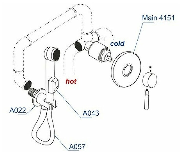 | Комплектация | Смеситель для душа Main 4151. Подключение шланга A022. Шланг для душа 1200 мм А057. Гигиеническая лейка с фиксатором A043. |
