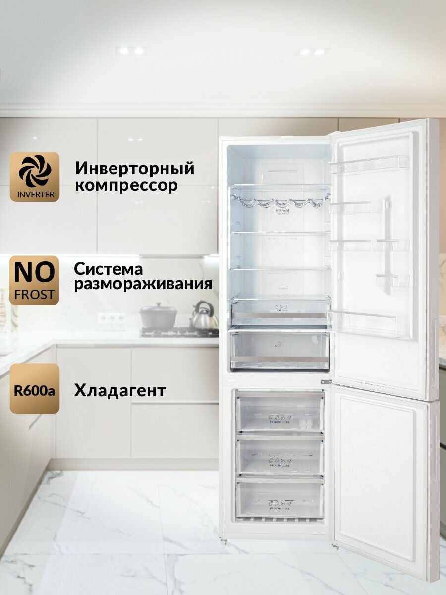 Холодильник HIBERG RFC-400DX NFGW inverter отдельностоящий, инвертер, высокий, комби, 2 метра, 380л объем, белое стекло
