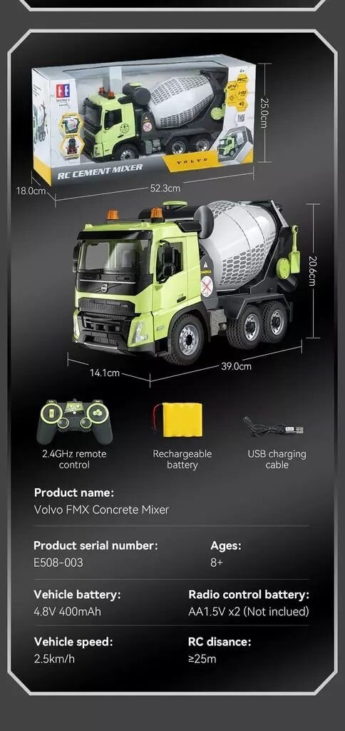 Ниже Вы можете прочитать отзывы на Радиоуправляемый бетоновоз Double Eagle Volvo FMX 1/20 2.4G RTR E508-003, ознакомится с подробными характеристиками, посмотреть интересные обзоры и фотографии на Радиоуправляемый бетоновоз Double Eagle Volvo FMX 1/20 2.4G RTR E508-003.