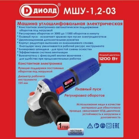 Купить Болгарка УШМ/Угловая шлифовальная машина Диолд МШУ-1,2-03 (константная электроника)/ 1200Вт, 11000 об/мин.